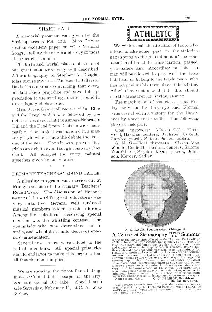 | Athletic | Men must pay dues to Athletic Association in order to compete in baseball or track; results of women's basketball game. |