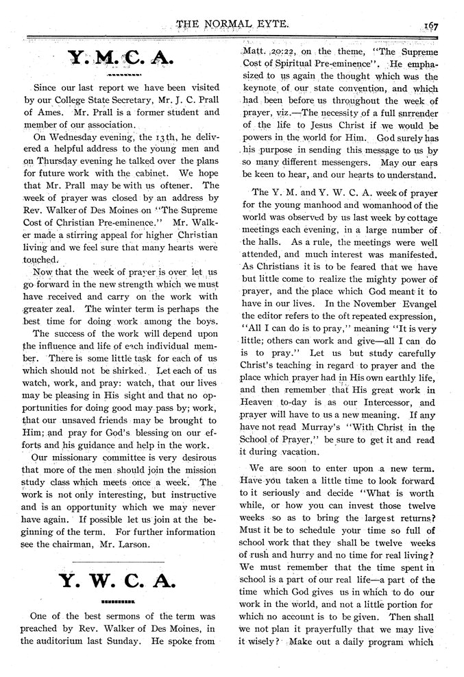 | Y. M. C. A. | State Secretary J. C. Prall visited; hopes more men will attend mission study meetings. |