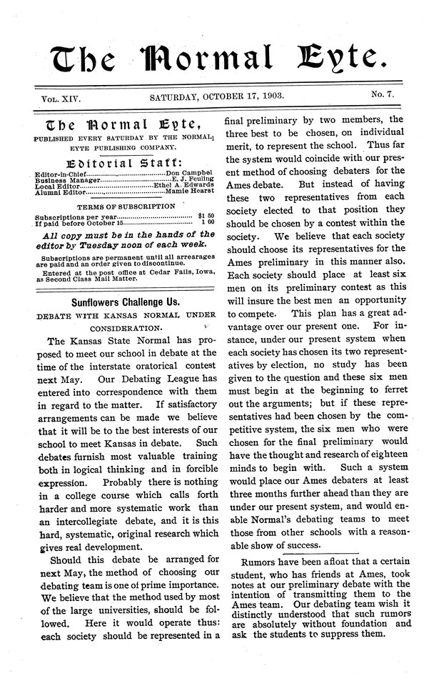 Sunflowers challenge us; debate with Kansas Normal under consideration Kansas State Normal has proposed a debate for next May.
