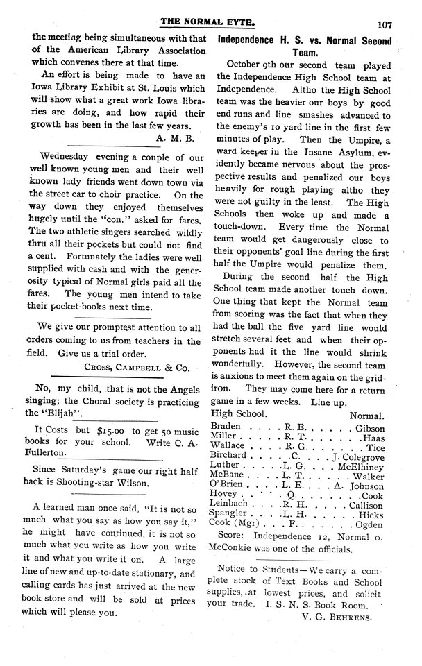 | Independence H. S. vs. Normal second team | Normal was defeated, 12-0, in football. |