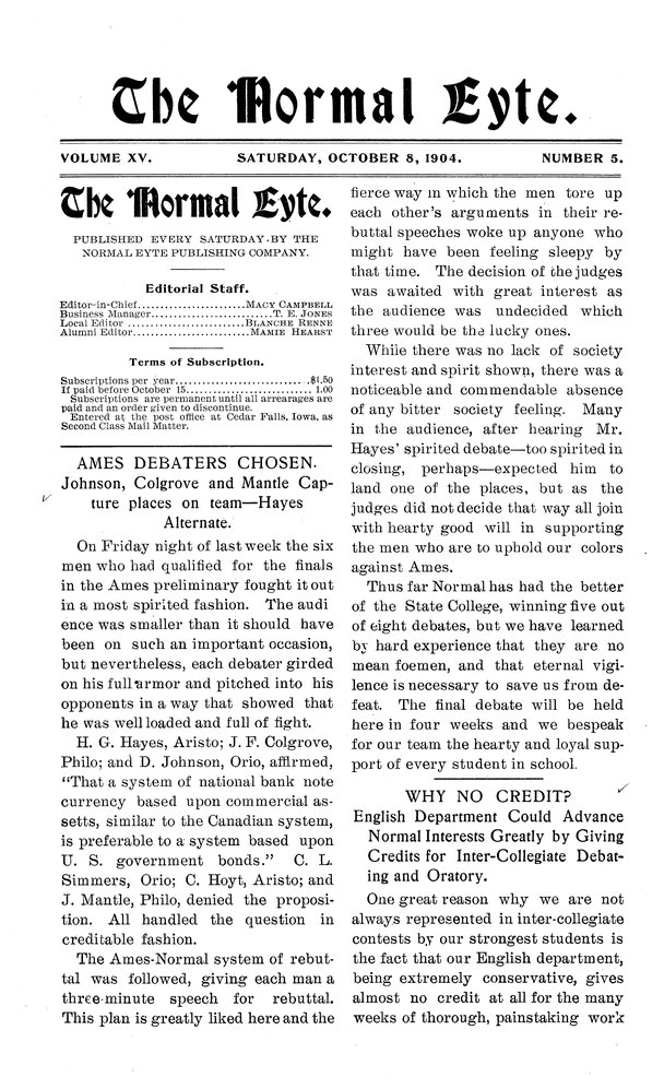 | Why no credit?; English Department could advance Normal interests greatly by giving credits for inter-collegiate debating and oratory | Editorial encourages the awarding of class credit to those involved in the debate and oratory teams to reward students for their hard work. |