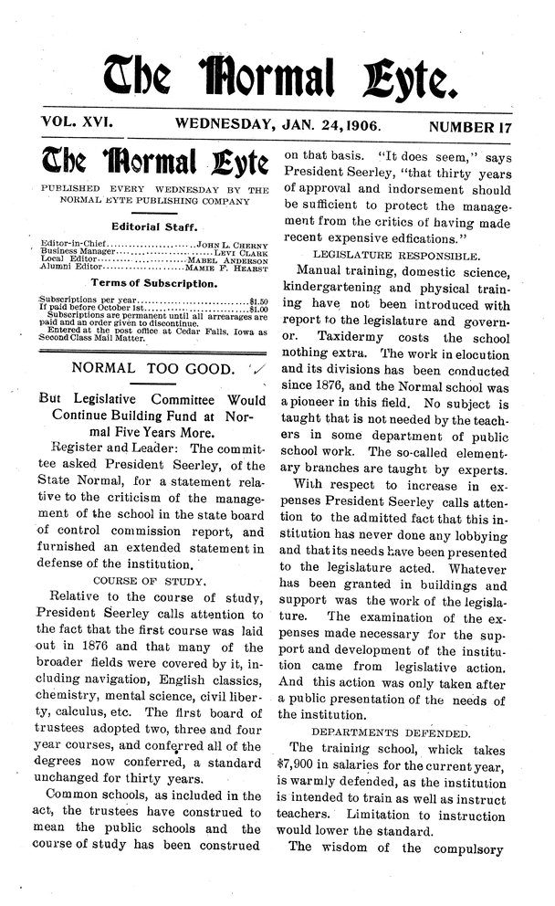 | Normal too good; but legislative committee would continue building fund at Normal five years more | President Seerley gives a statement about the management of the school; defends and explains the school's programs. |