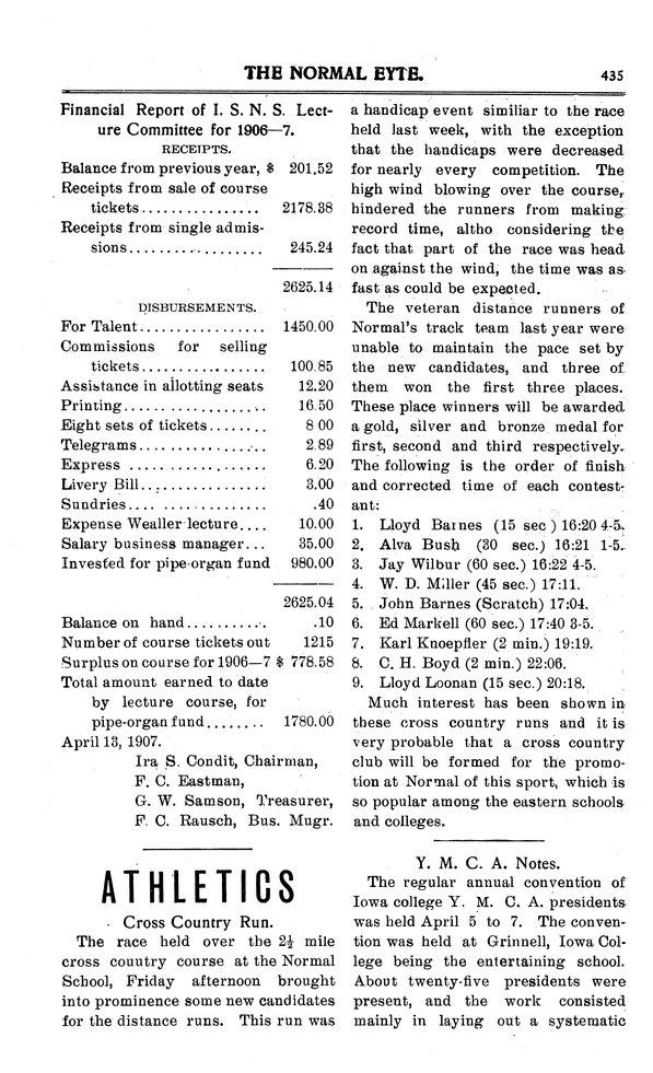 | Athletics | Cross country run of 2.5 miles at Normal. |