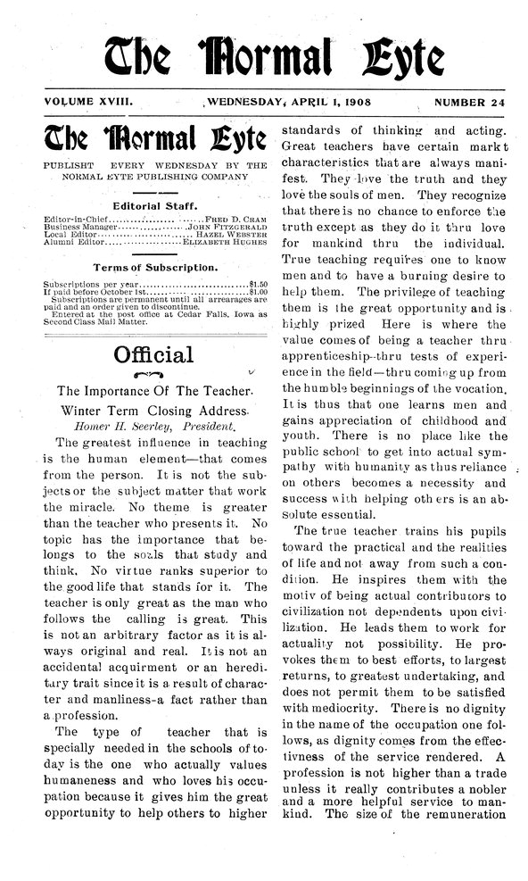 | Official | Text of President Seerley's winter term closing address: The Importance of the Teacher; believes that the greatest influence in teaching comes from the teacher him or herself rather than from subjects. |