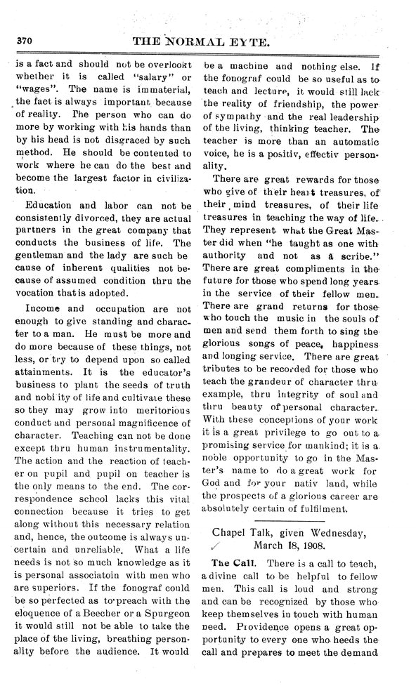 Chapel talk, given Wednesday, March 18, 1908 Believes that there is a call to teach, a divine call to help others.