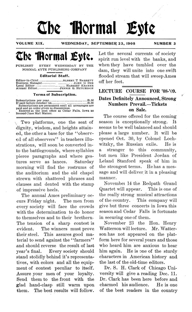 | Lecture Course for '08-'09; dates definitely announced, strong numbers prevail; tickets on sale | Lecture course schedule comes out. Performers include; Colonel Lochwitzky, Redpath Grand Quartet, Hon. Henry Watterson, Dr. S. H. Clark, Maud Powell, E. H. Baynes, Father L. J. Vaughan, and Dr. Frank H. Gunsaulus. |