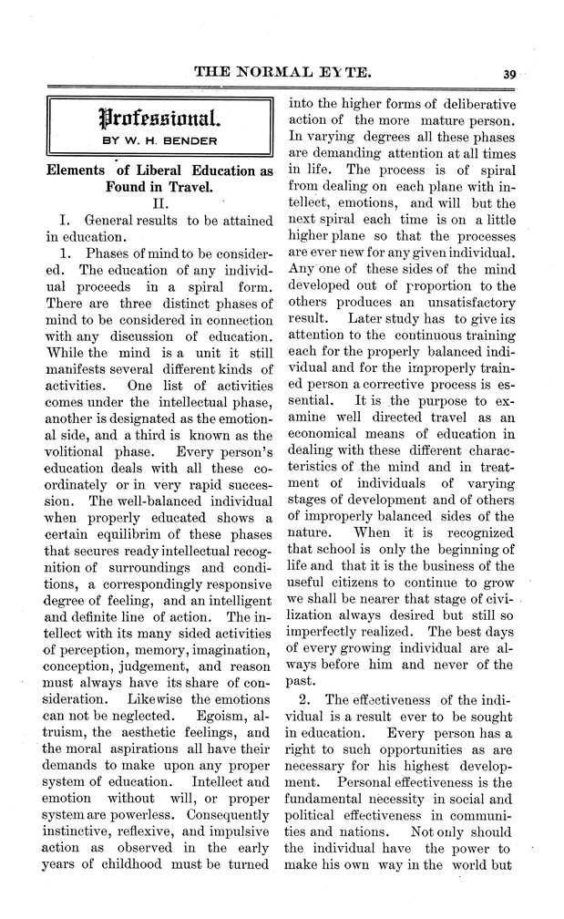| Professional; elements of liberal education as found in travel | Professor Bender outlines advantages of travel. |
