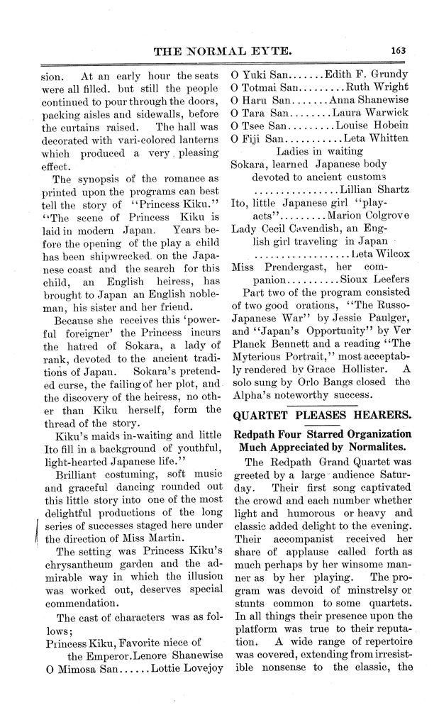 | Quartet pleases hearers; Redpath for starred organization much appreciated by Normalites | Review of performance by Redpath Grand Quartet. |