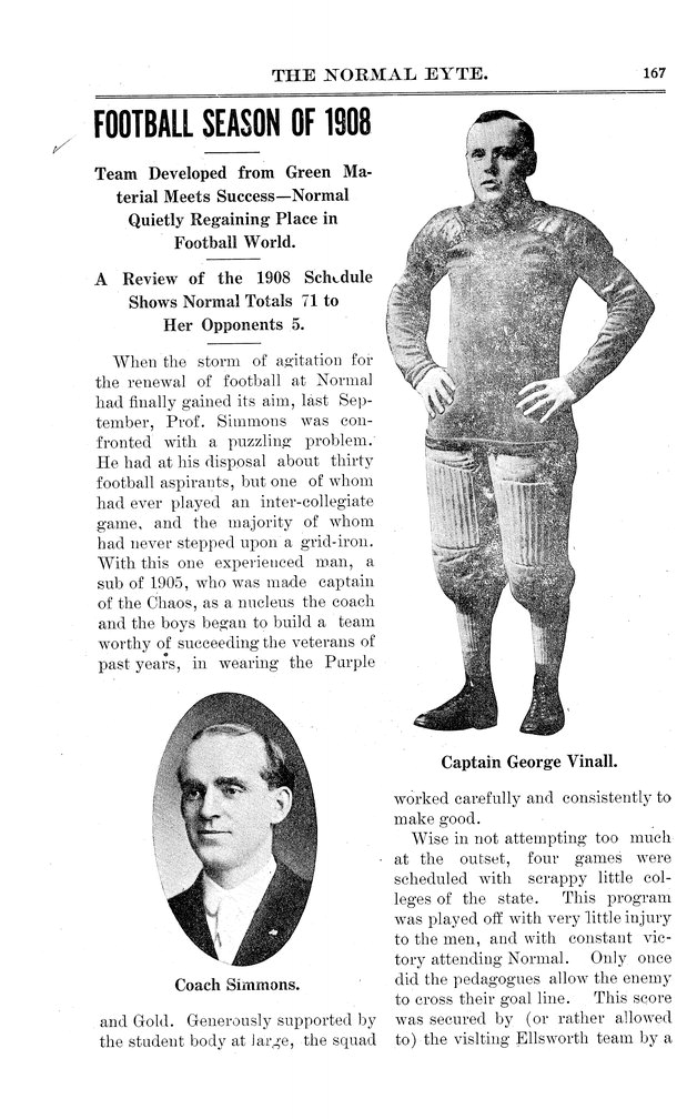 | Football season of 1908; team developed from green material meets success- Normal quietly regaining place in football world | A review of the 1908 schedule; photo. |