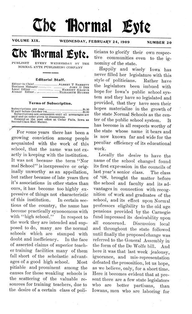 Untitled Outlines reasons why the word "Normal" should be dropped in any new name for the school; Class of 1908 credited with initiating movement for name change.