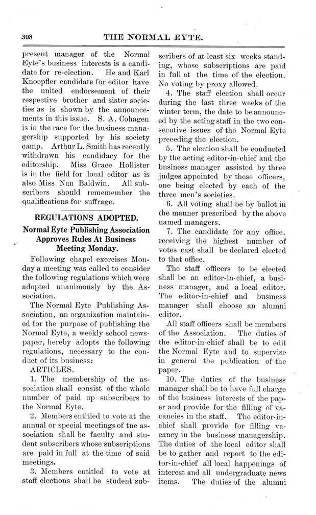 | Regulations adopted; Normal Eyte Publishing Association approves rules at business meeting Monday | Text of association regulations for election of staff and other matters. |