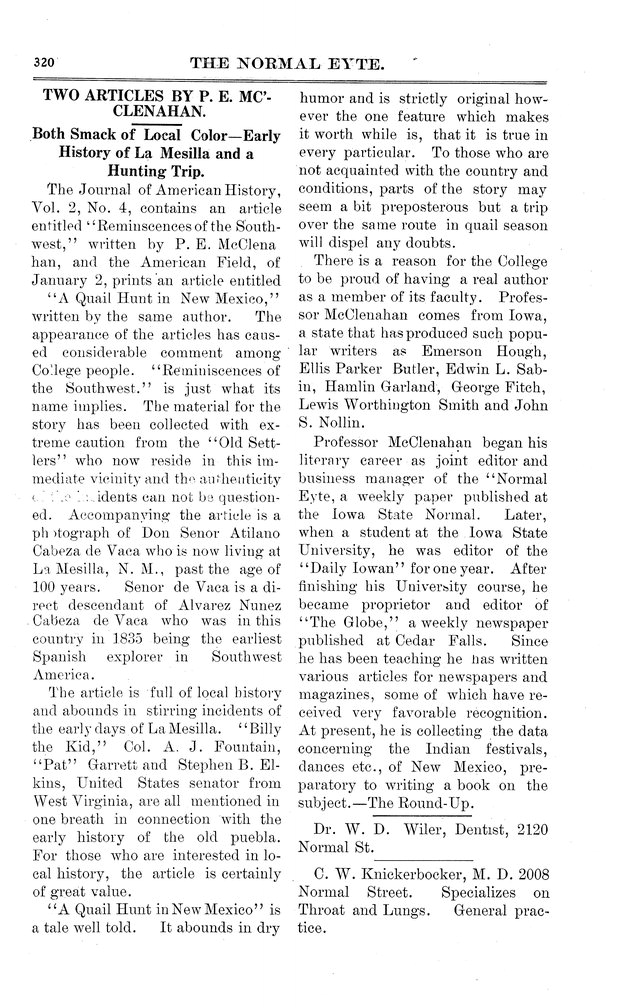 Two articles by P. E. McClenahan; both smack of local color--early history of La Mesilla a hunting trip Excerpts from Perry McClenahan's articles on the American Southwest.