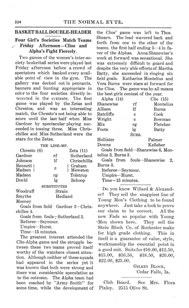 | Basketball double-header; four girls' societies match teams Friday afternoon-Clios and Alphas fight fiercely | Two women's intersociety games played, Zeta over Chresto and Clio over Alpha. |