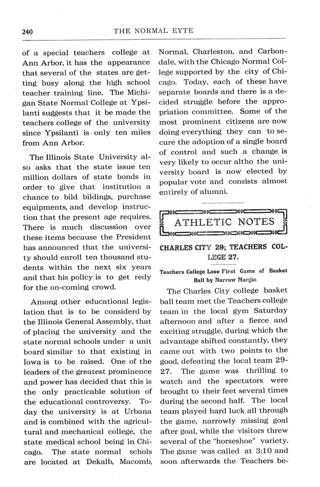 | Charles City 29; Teachers College 27; Teachers College lose first game of basketball by narrow margin | Account of the game. |