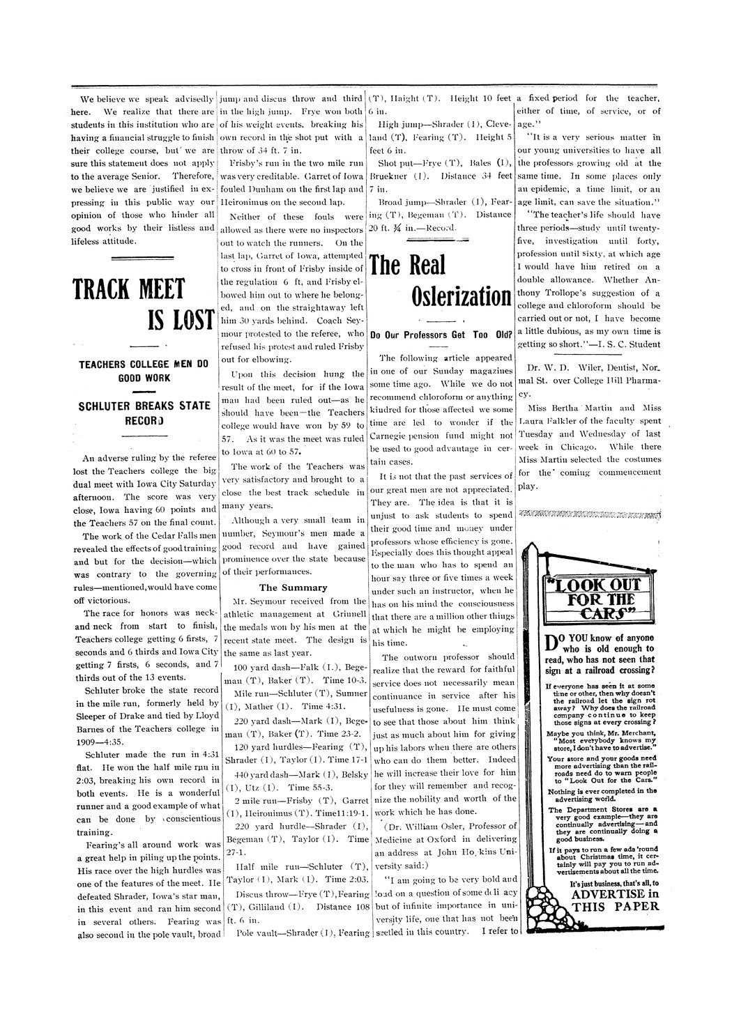 | Track meet is lost; Teachers College men do good work; Schluter breaks state record | Believes ISTC lost to University of Iowa because of a bad call by an official. |