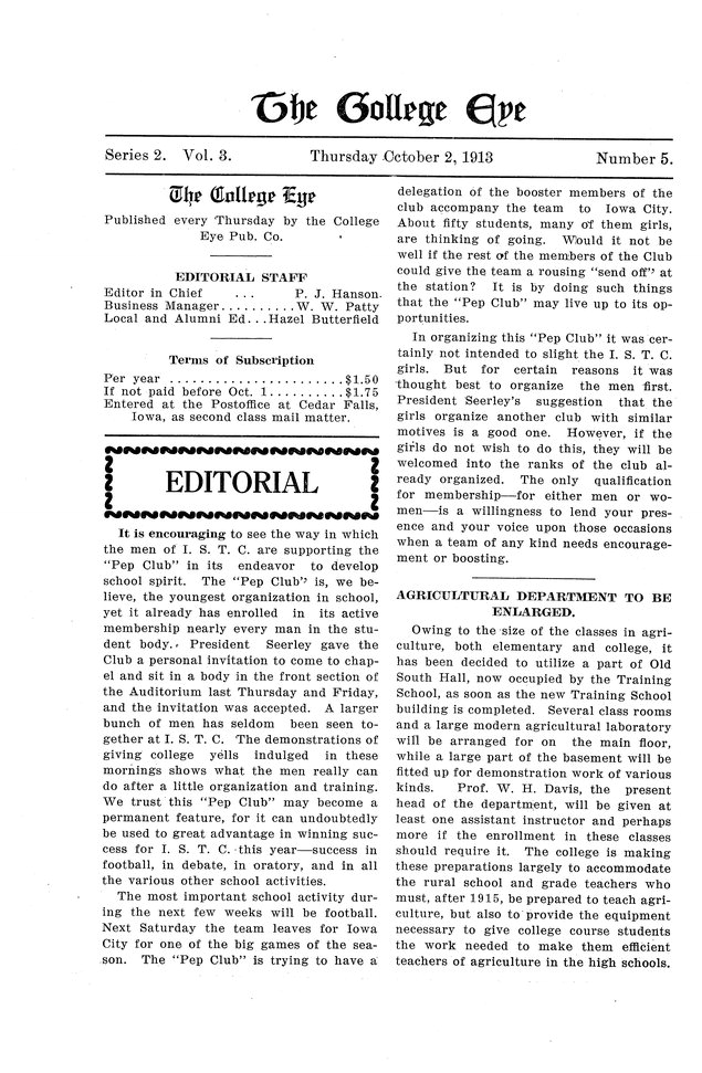 | Agricultural department to be enlarged | Will expand to have classrooms and a large laboratory in the Old South Hall; to accommodate need of rural school teachers to take courses in that curriculum; staff will be expanded. |