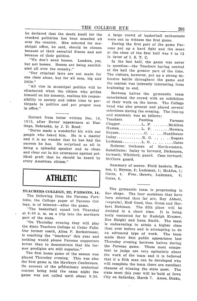 Athletic Basketball team defeated Parsons, 22-14; four members have been selected for the gymnastics team.
