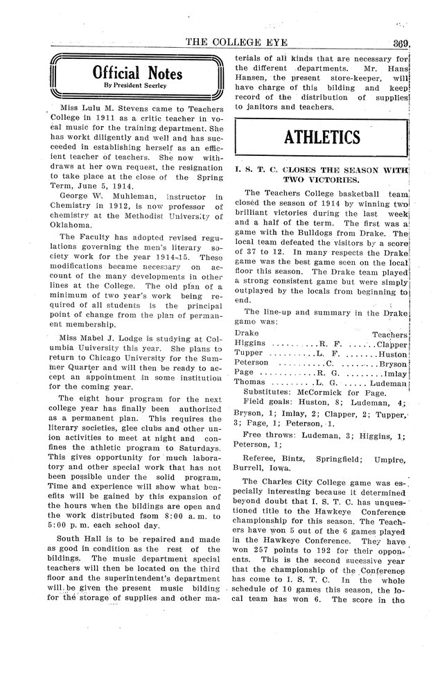 | Athletics | Basketball team defeated Drake, 37-12 and Charles City, 49-16. |