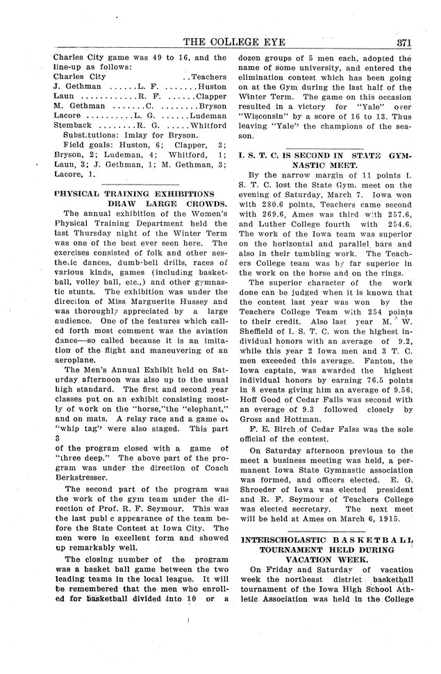 | I. S. T. C. is second in state gymnastic meet | Iowa won with 280.6 points, T. C. came in second with 269.6, Iowa State was third with 257.6, and Luther was fourth with 254.6 points. |