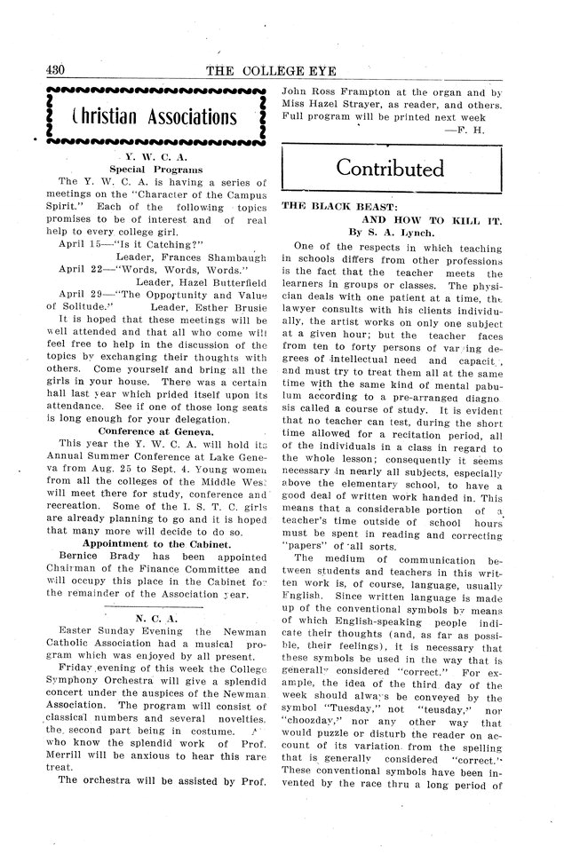 Christian Associations Y. W. C. A. discussed school spirit; N. C. A. held music program.