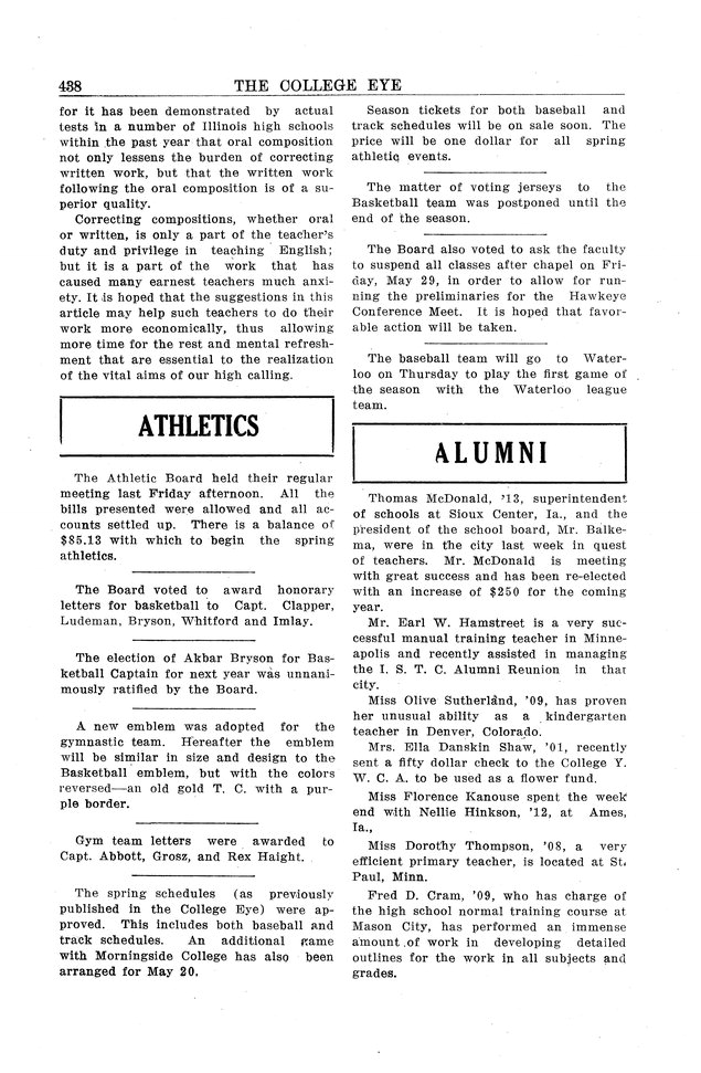 | Athletics | Athletic Board has $85 for spring sports; awards athletics letters. |