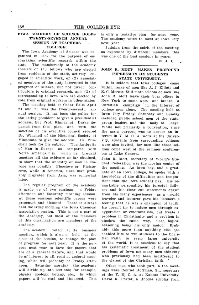 | John R. Mott makes profound impression on students of state university | Spoke at University of Iowa. |