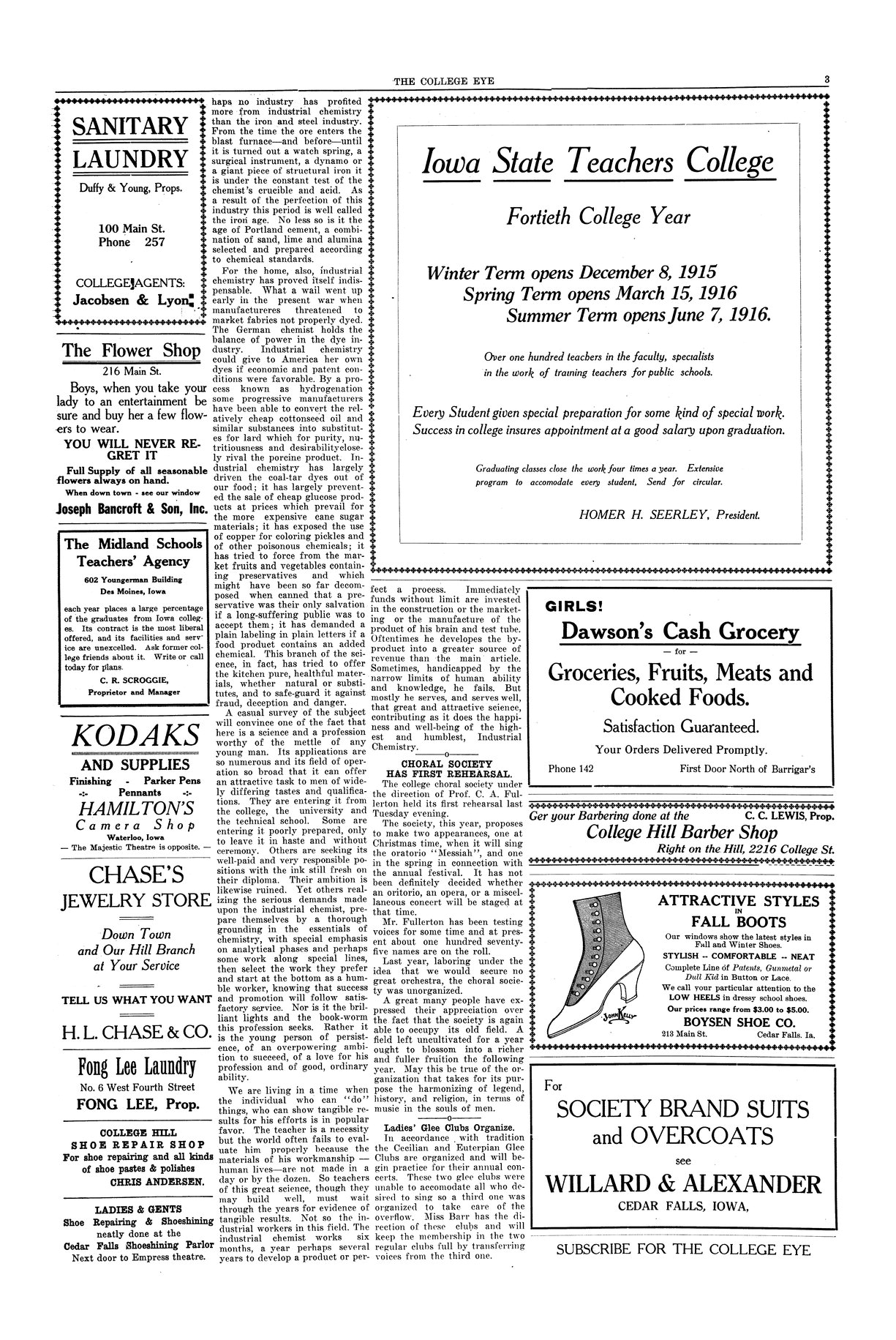 Choral Society has first rehearsal Charles Fullerton is directing the Choral Society; currently has one hundred seventy members; will perform once during the winter and once at the end of the spring term.