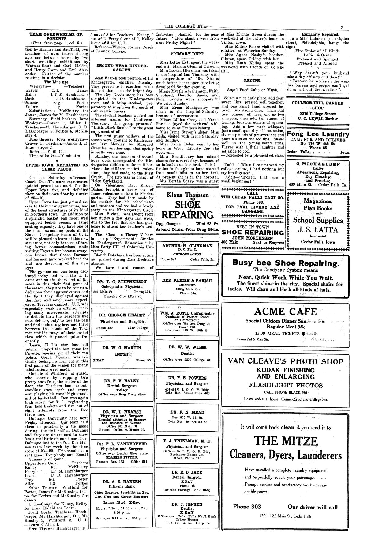 Upper Iowa defeated on their floor T. C. won basketball game, 25-10.