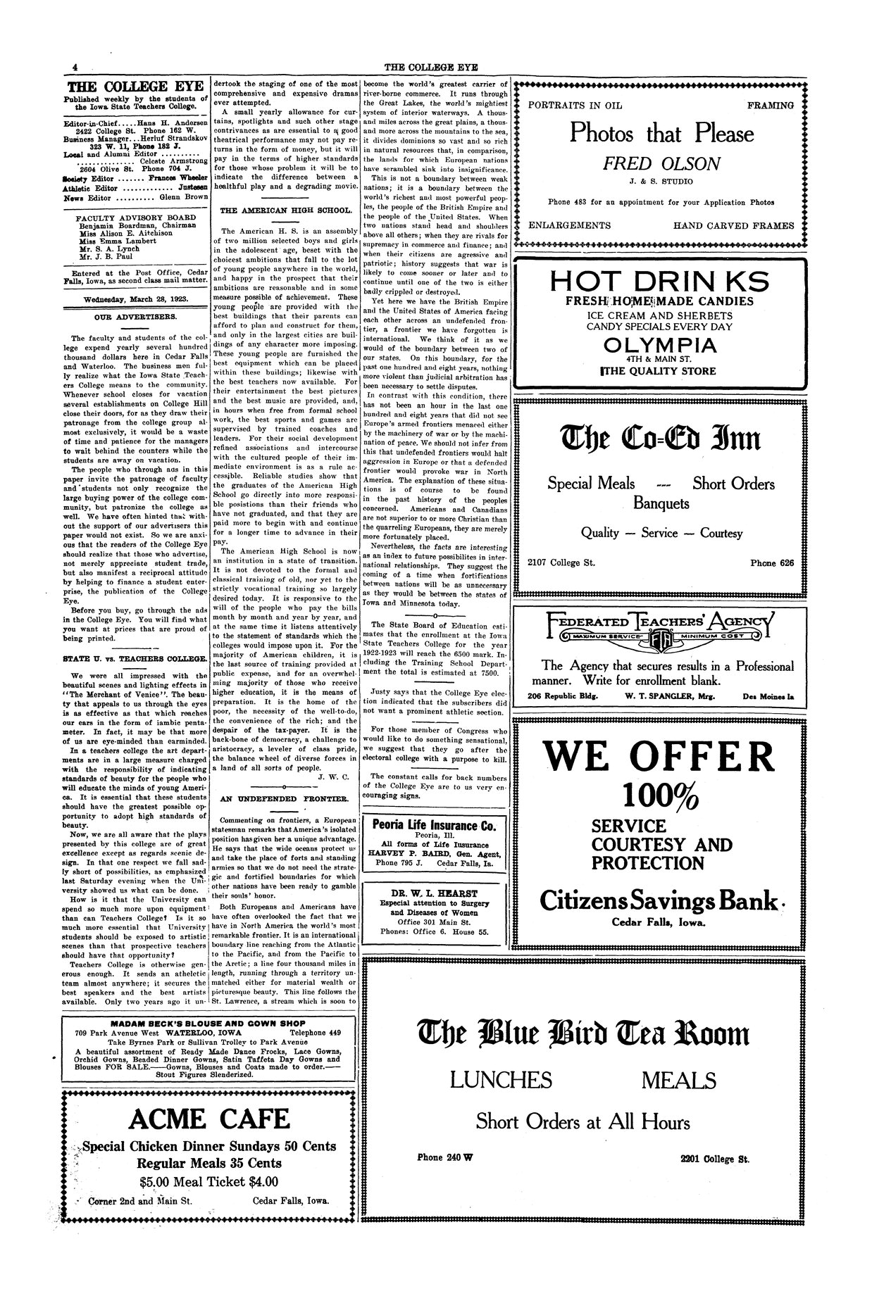 | State U. vs. Teachers College | Compares the State University of Iowa and Teachers College dramatic productions; finds I. S. T. C. lacking. |
