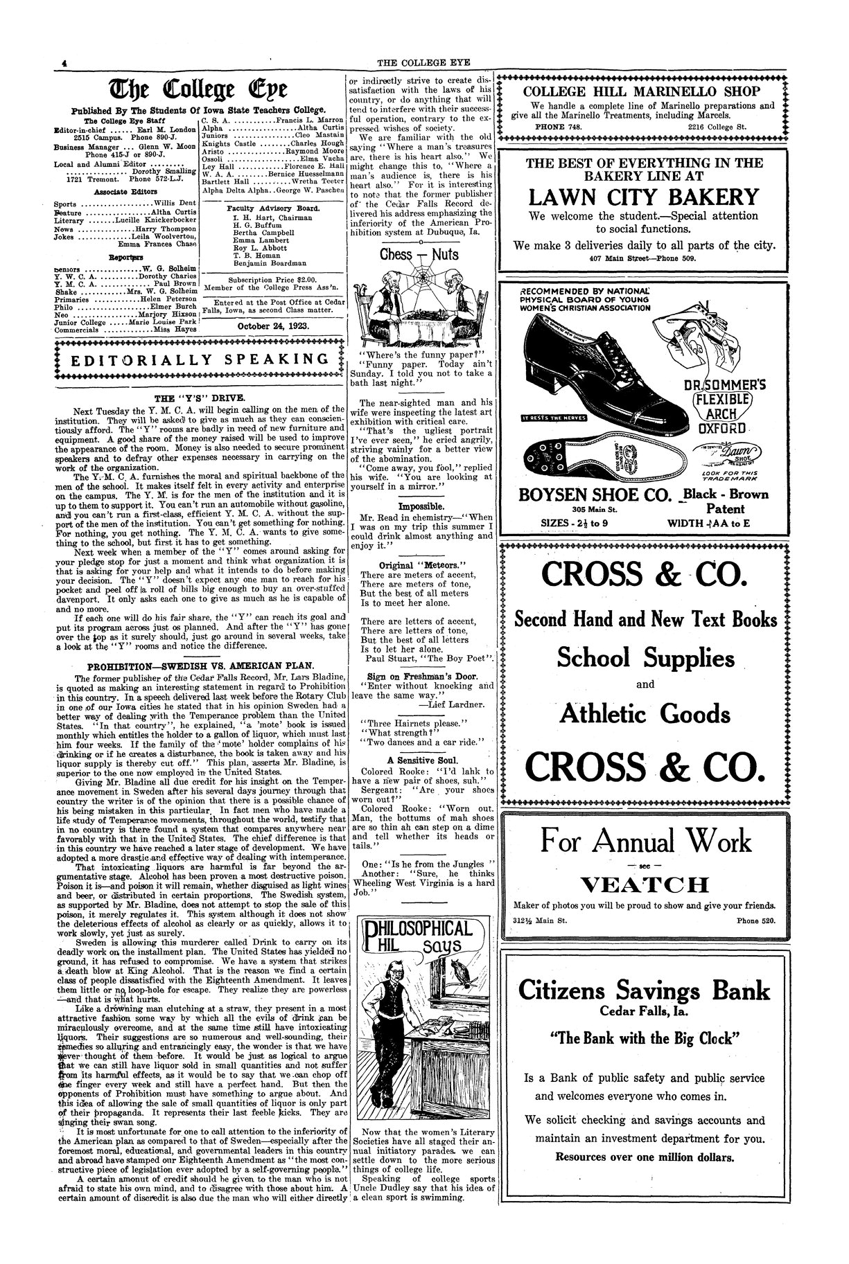| Editorially speaking; the "Y's" drive | Encourages students and faculty to donate to the Y. M. C. A. |