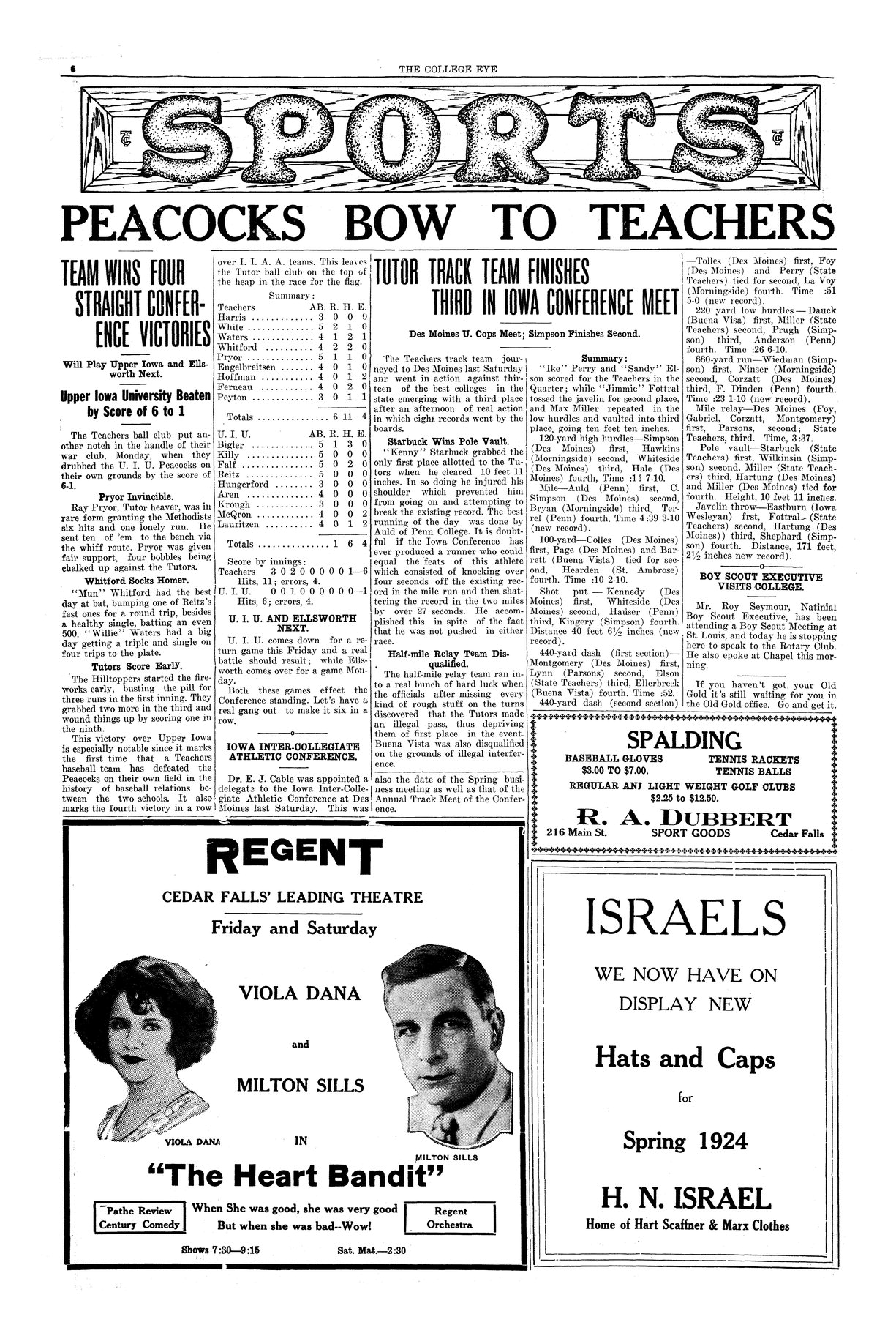 | Tutor track team finishes third in Iowa conference meet; Des Moines U. cops meet; Simpson finishes second | Starbuck won the pole vault; half mile team was disqualified because of an illegal pass, but would have been first. |