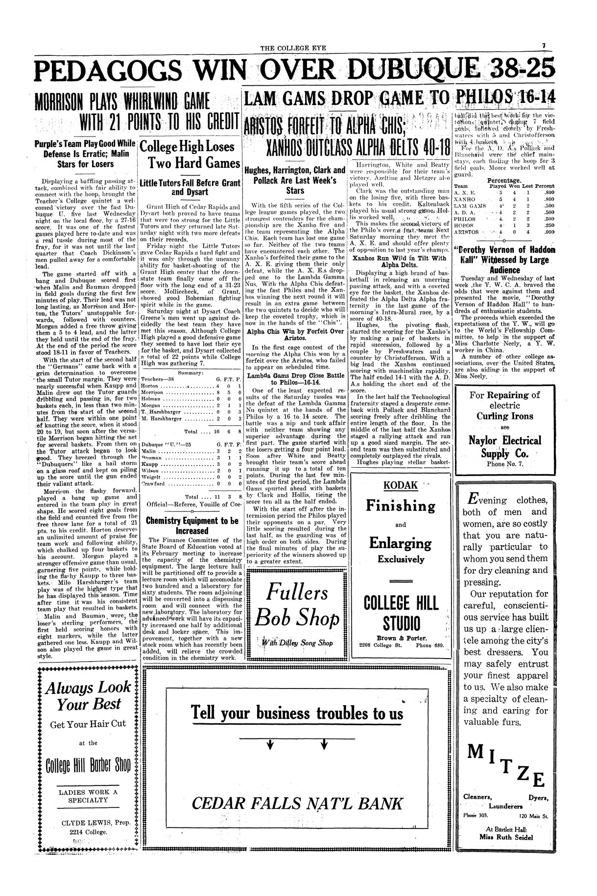 | Pedagogs win over Dubuque 38-25; Morrison plays whirlwind game with 21 points to his credit | Tutors defeat Dubuque in basketball, 38-25. |