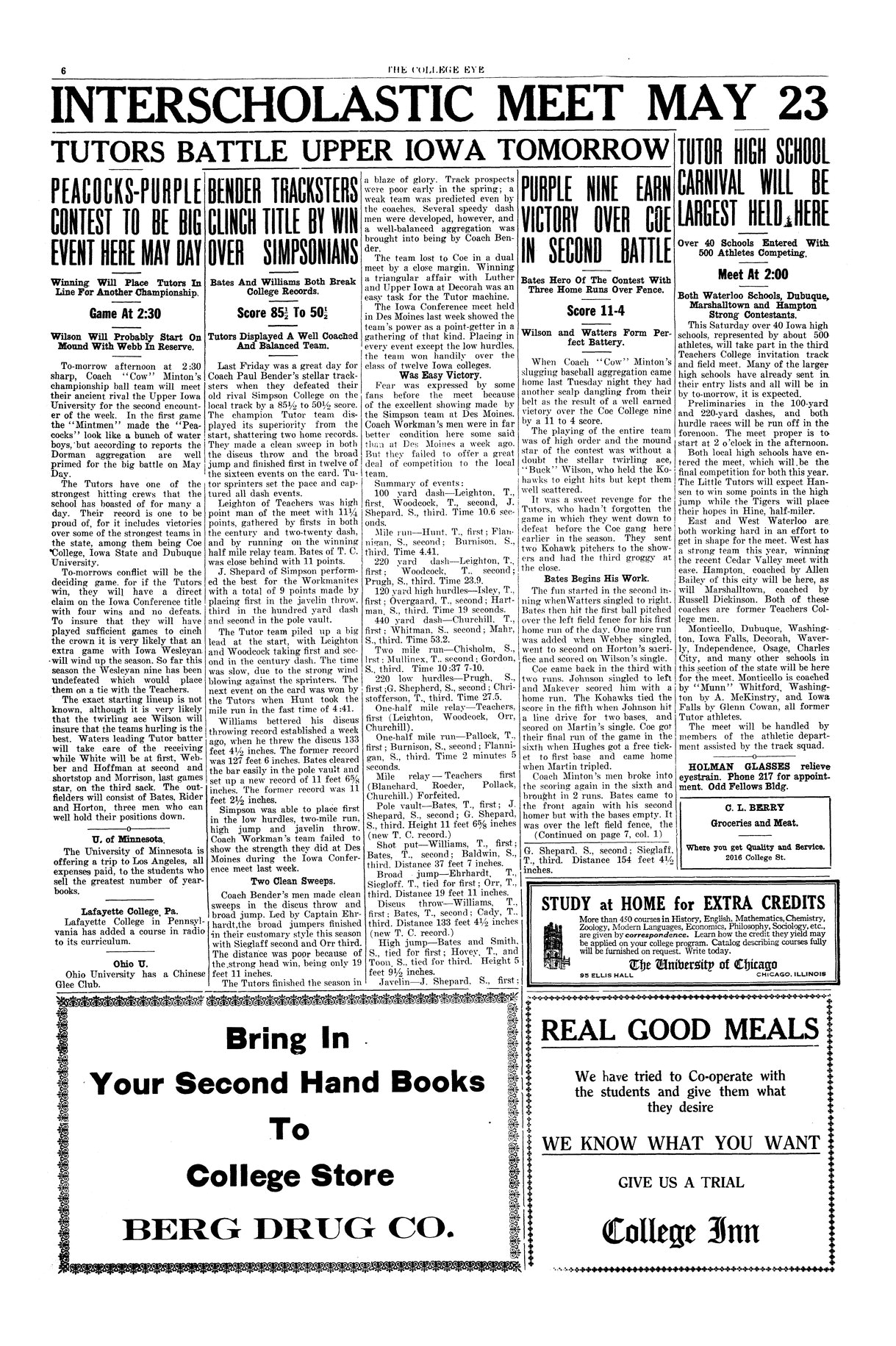| Tutors battle Upper Iowa tomorrow; Peacocks-Purple contest to be big event here May Day | Preview of upcoming baseball game against Upper Iowa. |