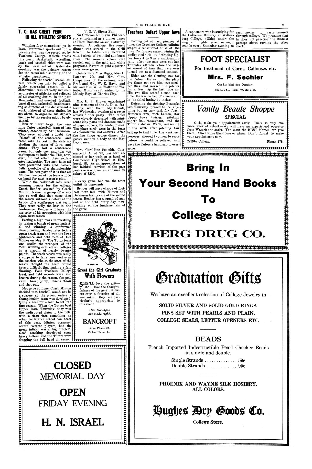 | T. C. has great year in all athletic sports | T. C. wins conference championships in basketball, wrestling, track, and baseball. |