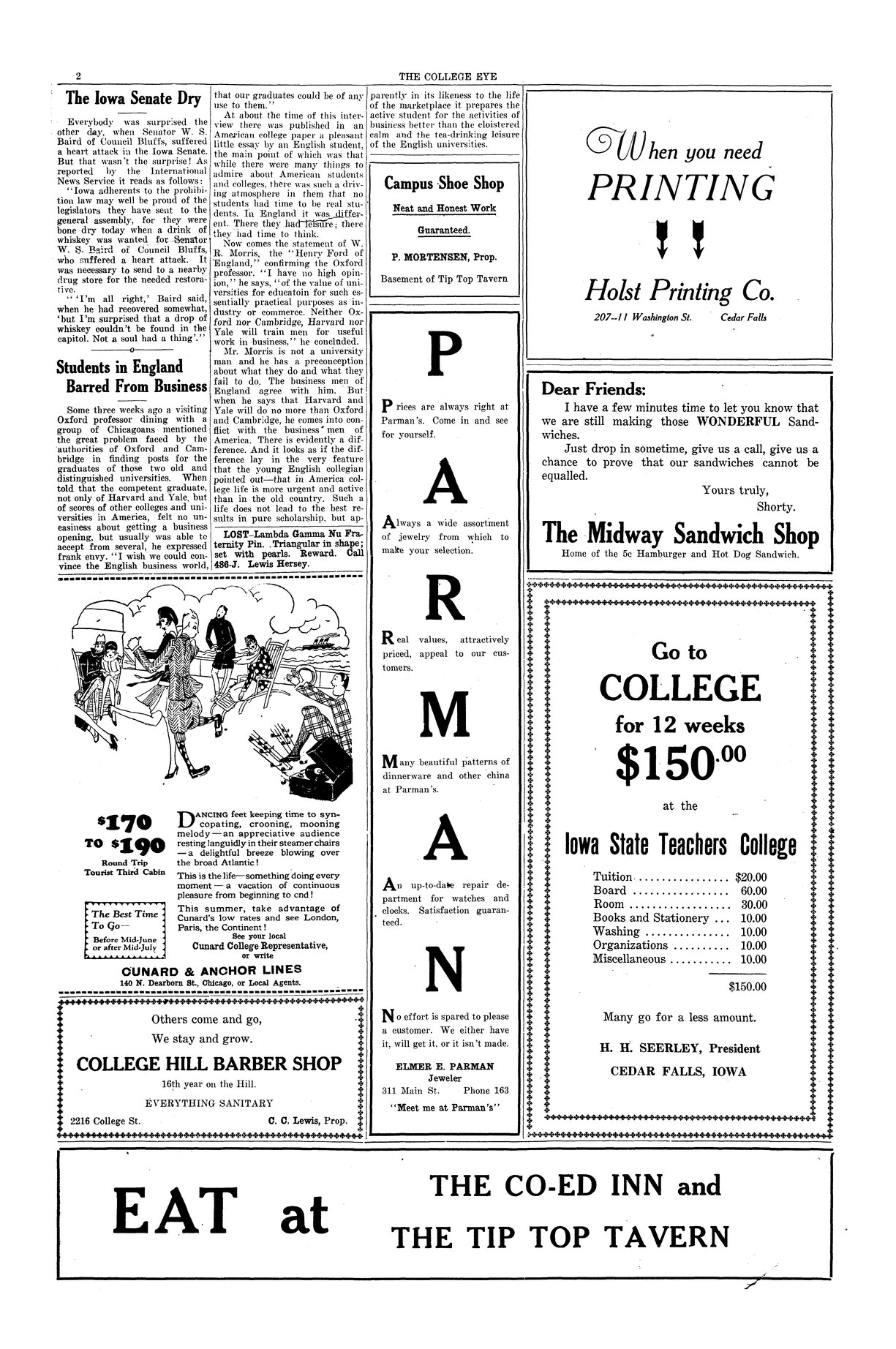 | The Iowa Senate dry | A stimulant of whiskey could not be found when a senator had a heart attack. |