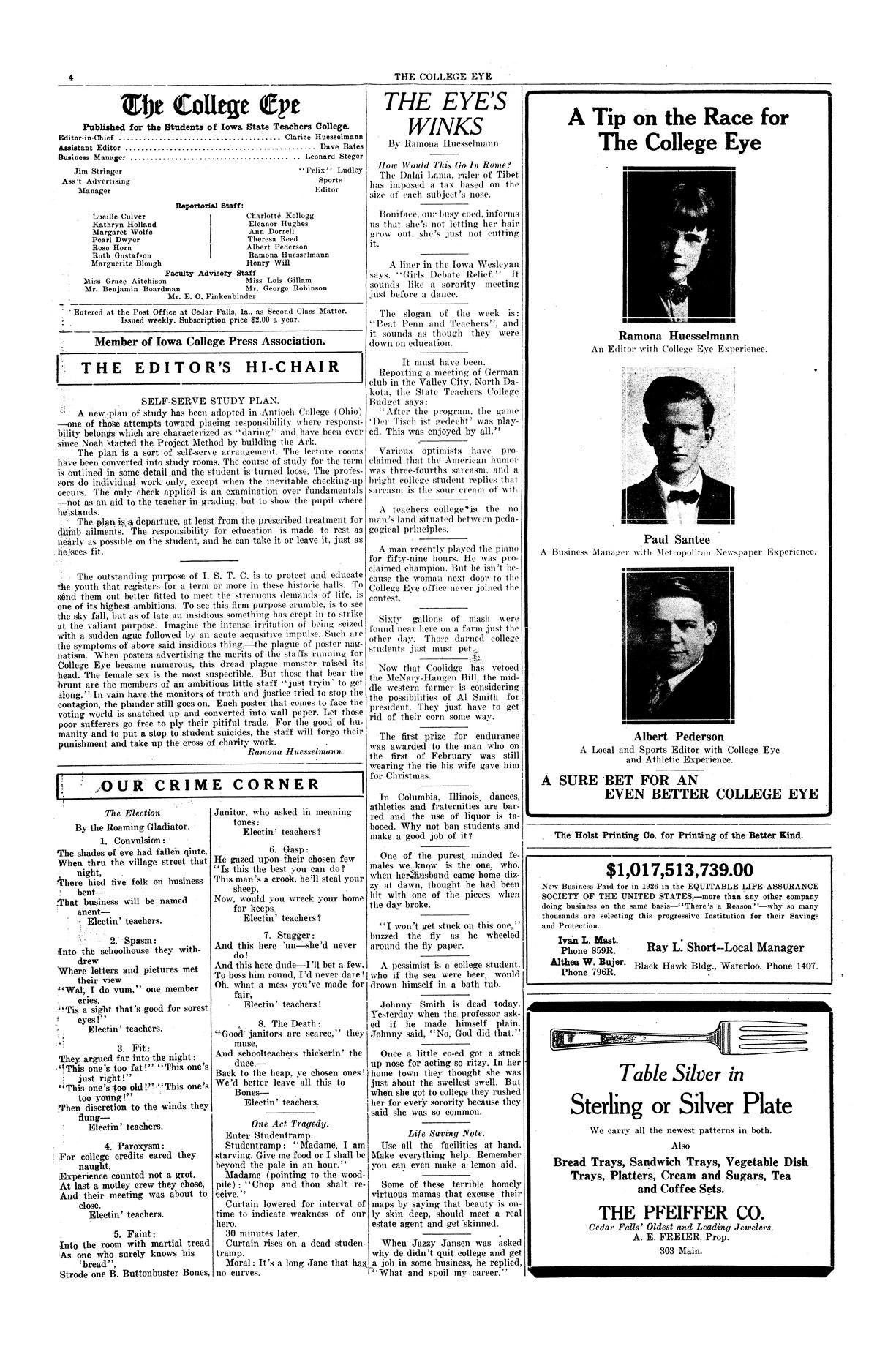 | A tip on the race for the College Eye | Ramona Huesselmann, Paul Santee, and Albert Pederson, candidates for the College Eye staff; photo. |