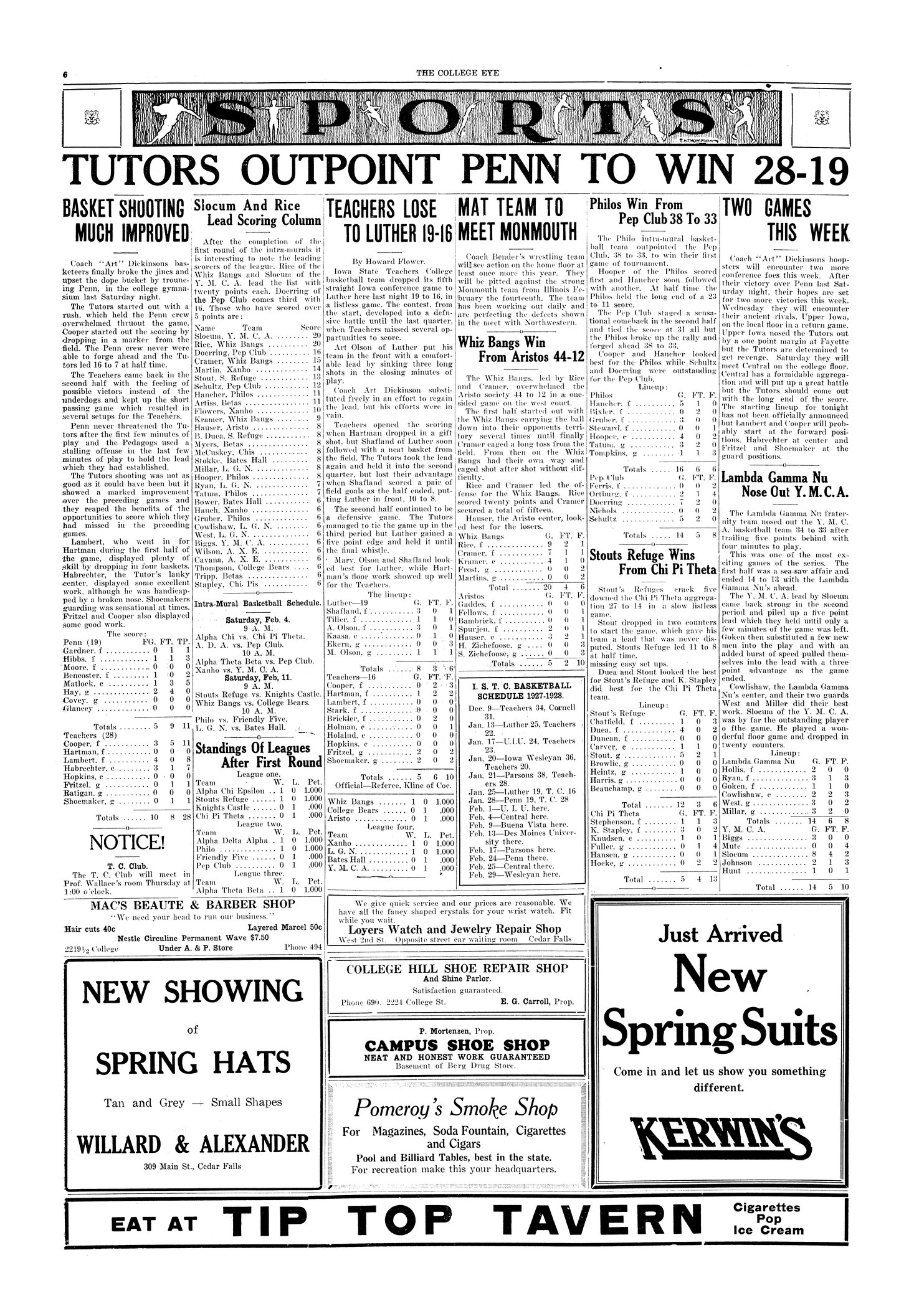 | Tutors outpoint Penn to win 28-19; basket shooting much improved | Basketball team wins; statistics of game. |