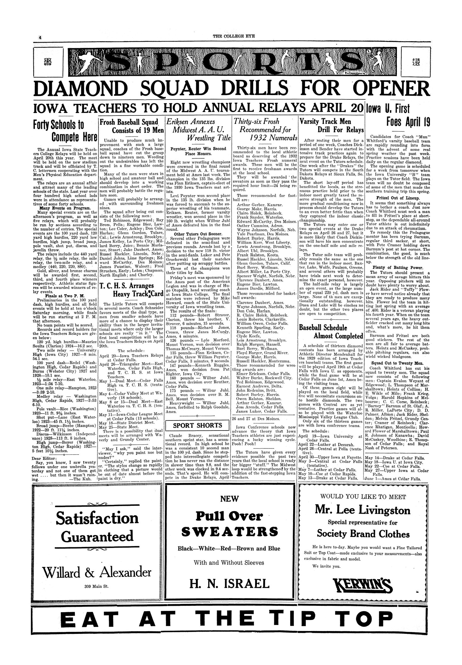 | Iowa teachers to hold annual relays April 20; forty schools to compete here | Records and record holders for the events. |