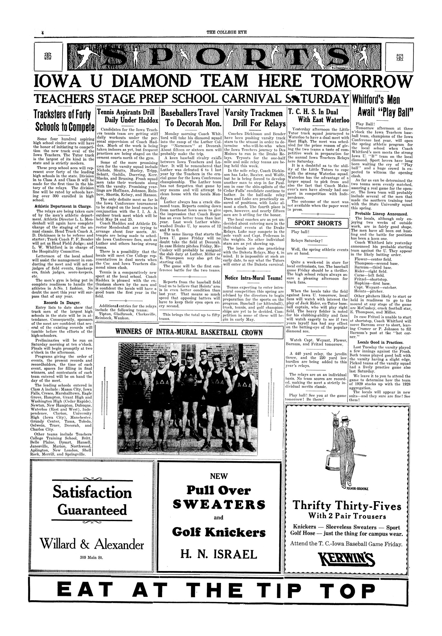 | Iowa U. diamond team here tomorrow; Whitford's men await "play ball" | Teams are evenly matched; T. C. hopes to win because of the many returning players. |