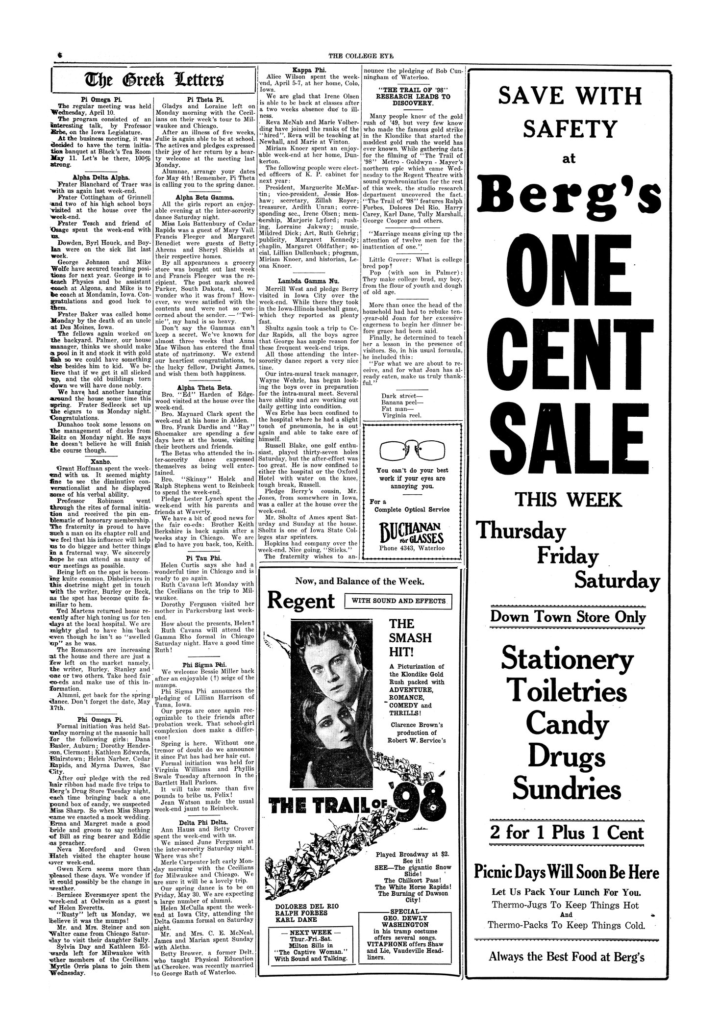 | Lambda Gamma Nu | Members visit Iowa City and Chicago, intersorority dance, intramural track meet, visitors, and pledge announced. |
