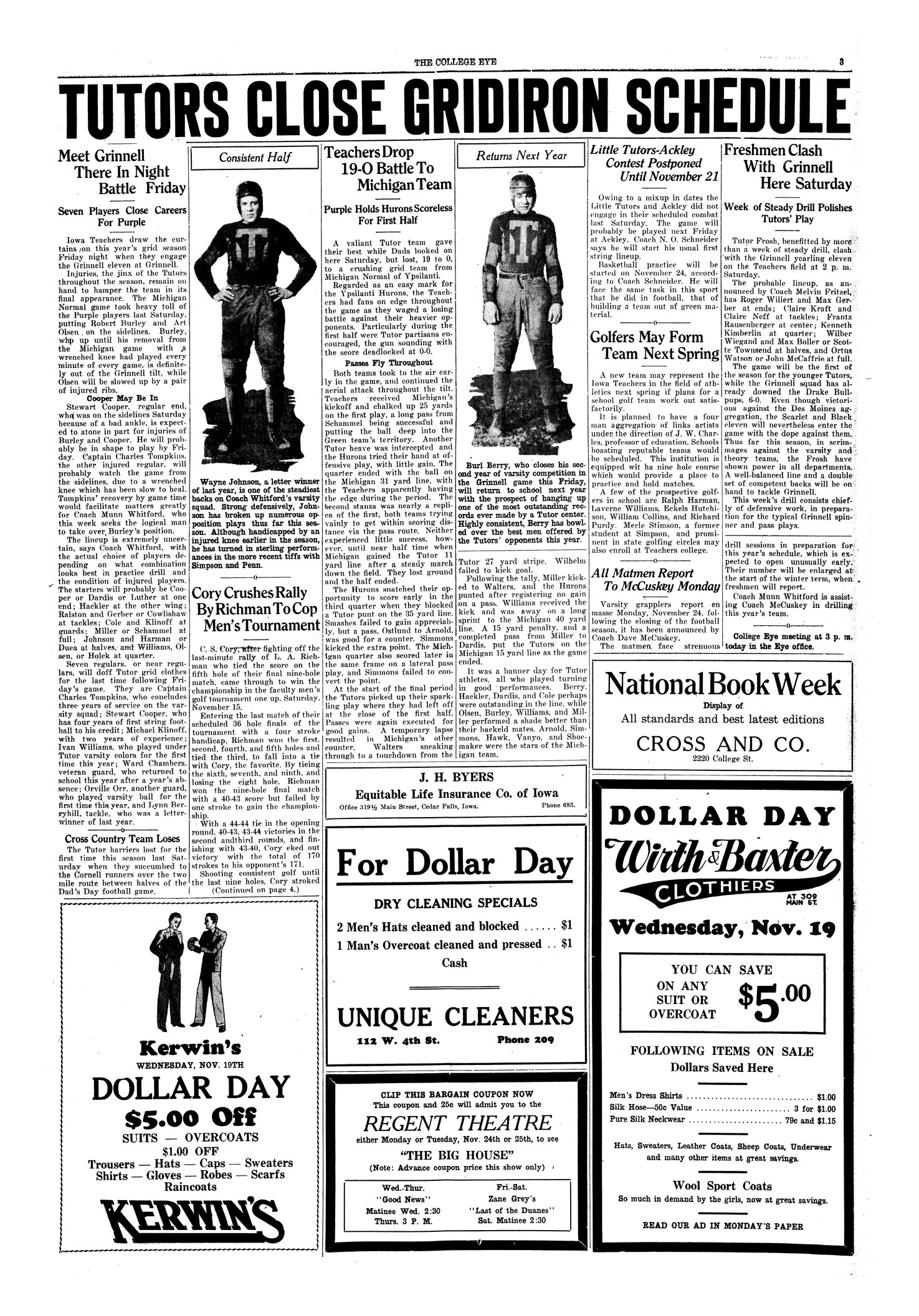 | Tutors close gridiron schedule; meet Grinnell there in night battle Friday | Last game of the season to be played at Grinnell College. |