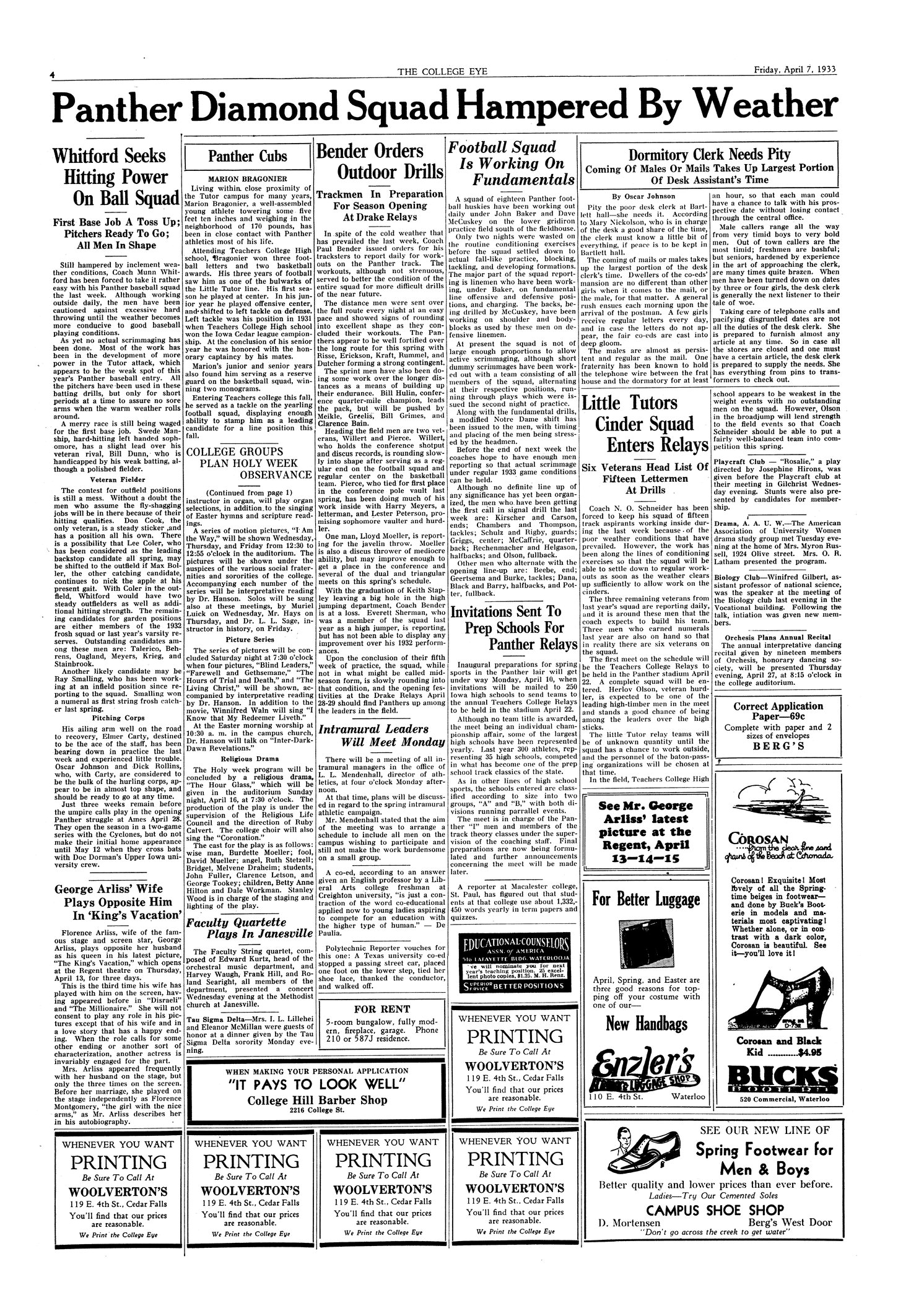 | Bender orders outdoor drills; trackmen in preparation for season opening at Drake Relays | Tracksters report to workout at the Panther track to get ready for more strenuous workouts later on. |