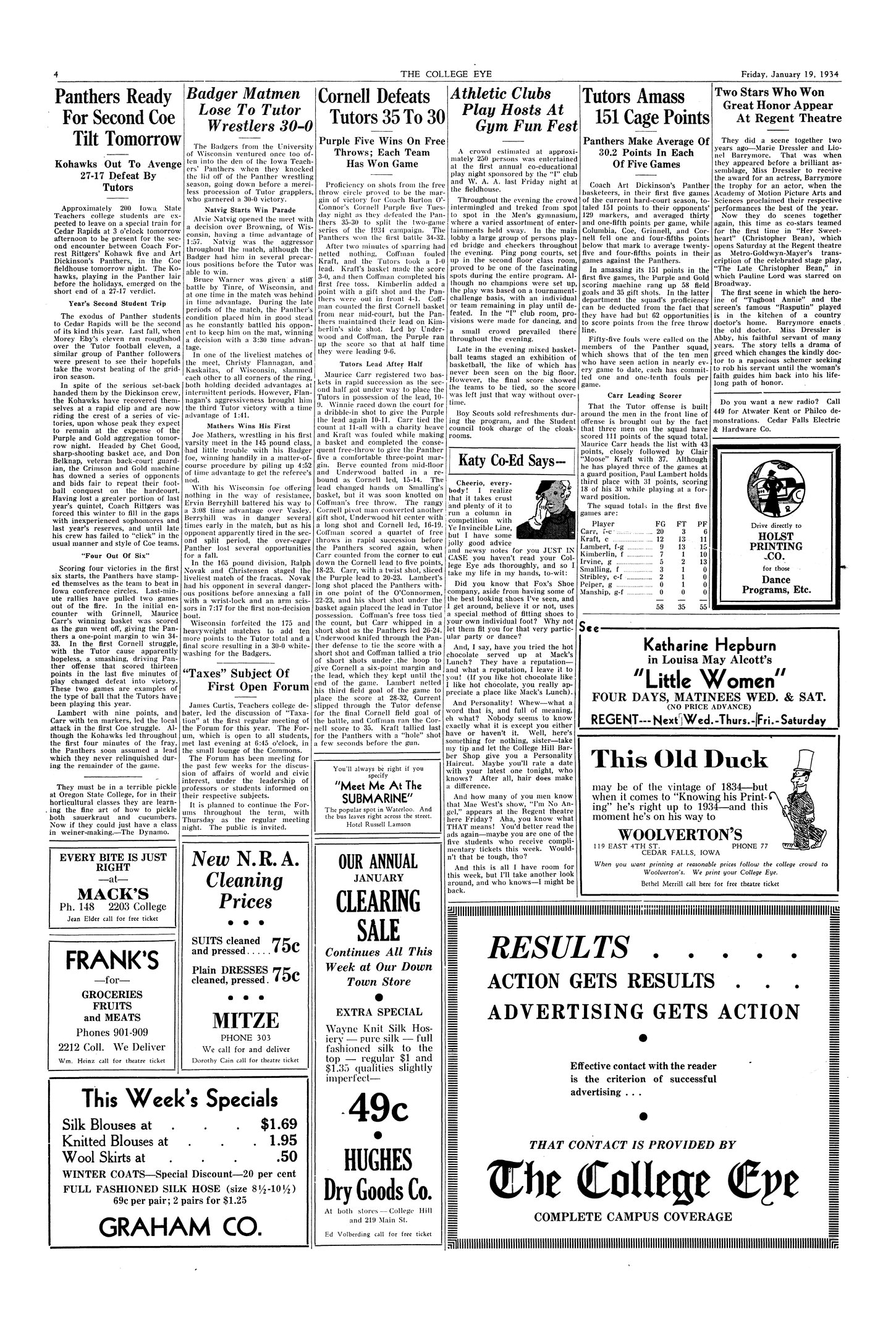 Cornell defeats Tutors 35-30; Purple Five wins on free throws; each team has won game Panthers lost lead that they took in the first half.