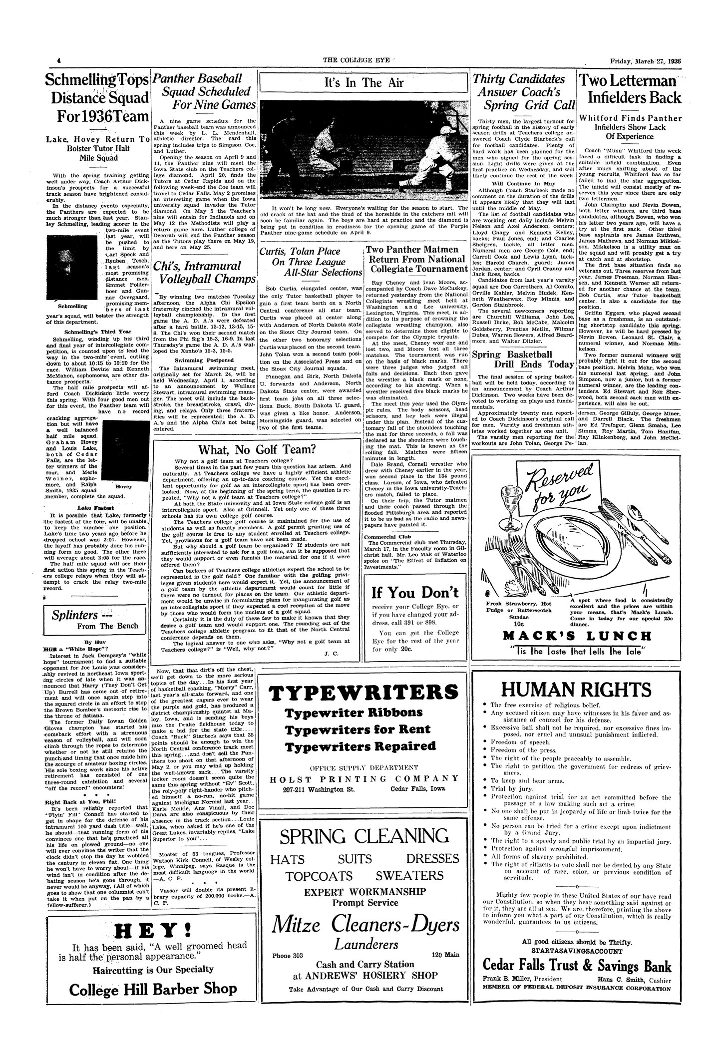 | Panther baseball squad scheduled for nine games | The 1936 season schedule is announced; ISTC will open against Iowa State; photo. |