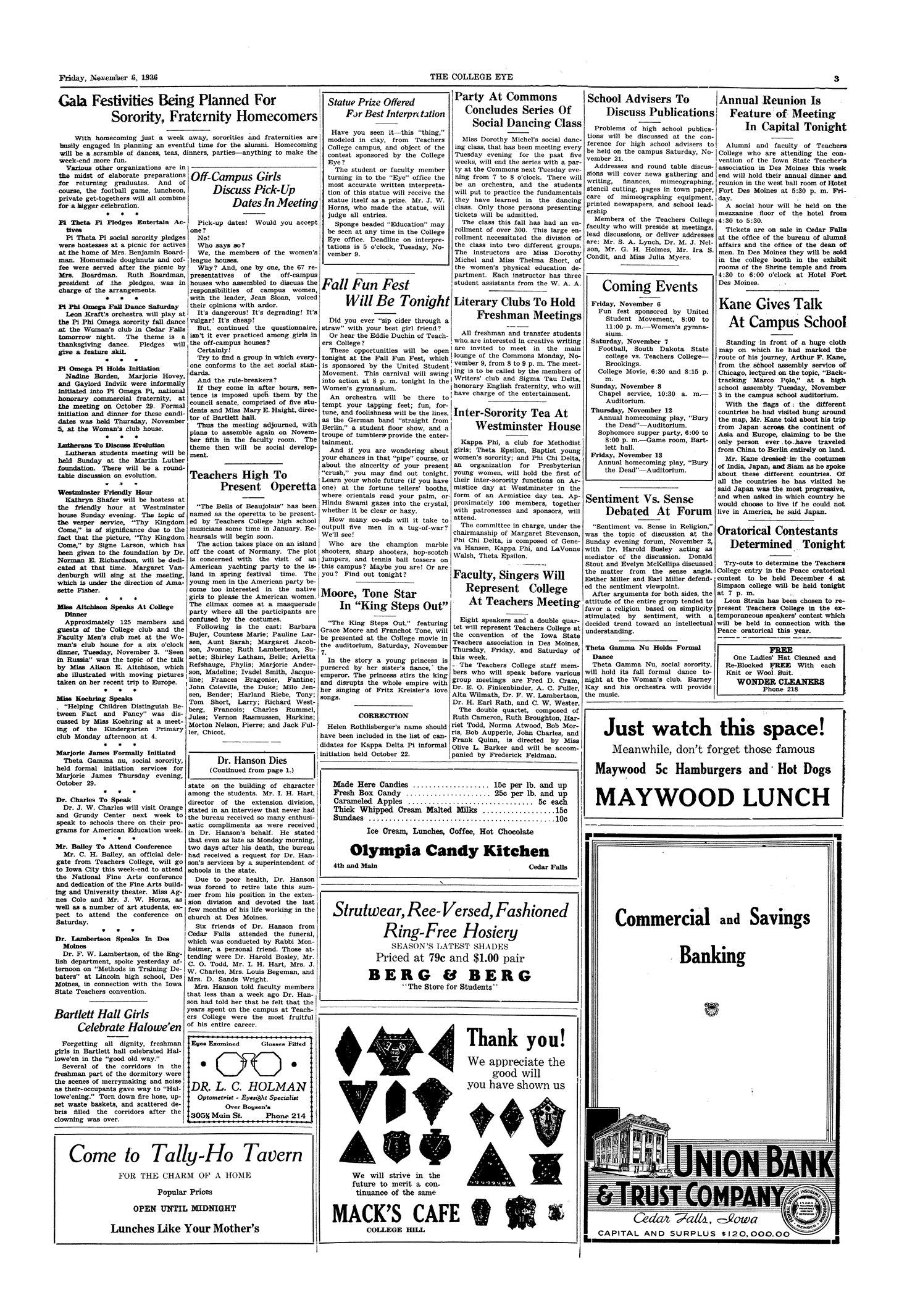 | Inter-sorority tea at Westminster House | Kappa Phi and Phi Chi Delta will hold tea. |