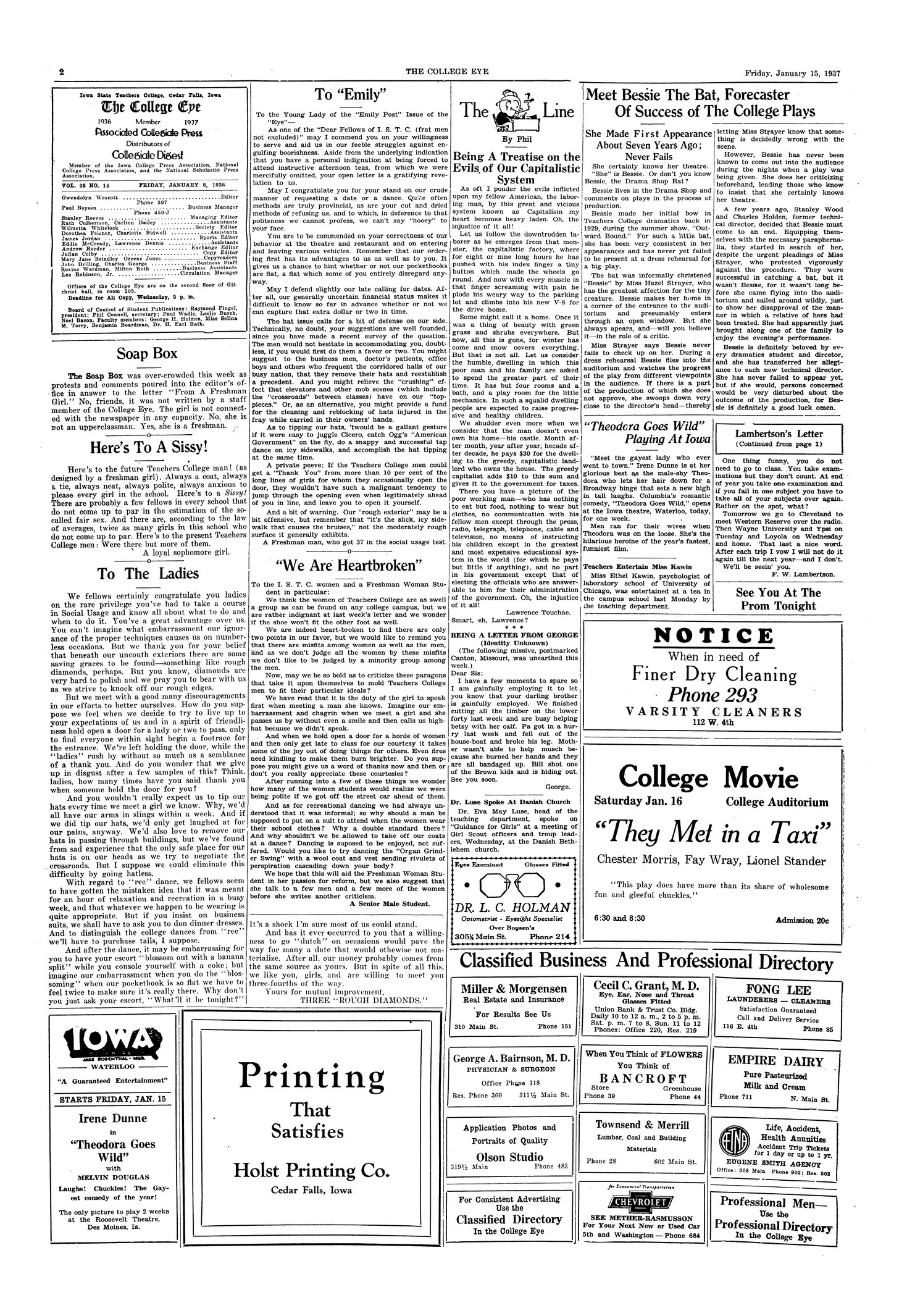 | Meet Bessie the Bat, forecaster of success of the college plays; she made her first appearance about seven years ago; never fails | Auditorium Building bat has become a favorite of Professor Strayer. |
