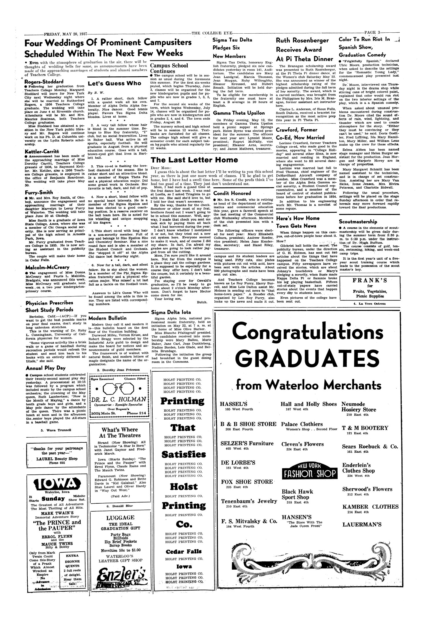 Four weddings of prominent campusiters scheduled within the next few weeks Margaret Stoddard will marry Rutherford Rogers; Dorothy Carritt will marry Ray Kettler; Marvelyn Smith will marry Leroy Furry; Donna McCreary will marry Ferris L. Malcolm.