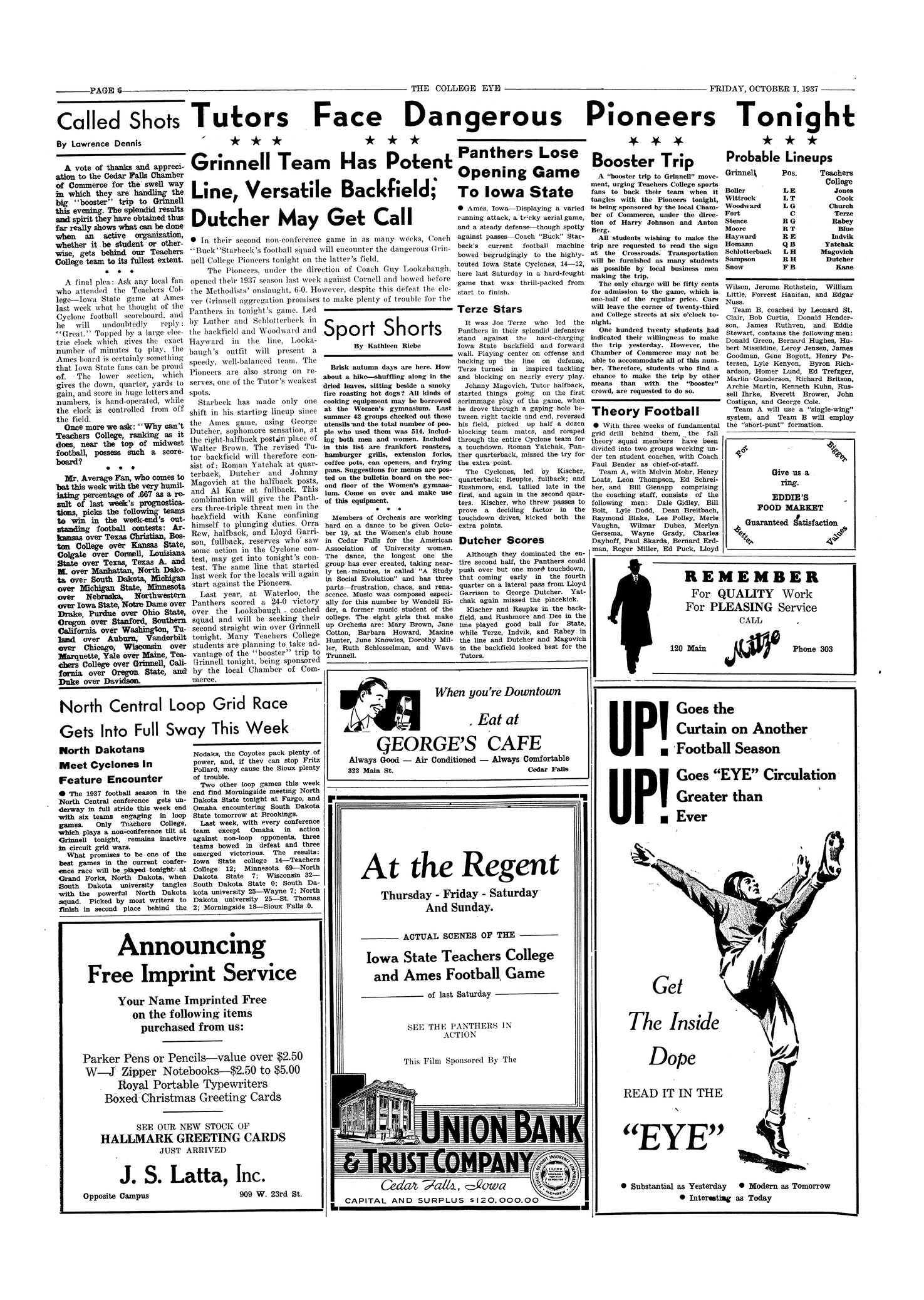 | Tutors face dangerous Pioneers tonight; Grinnell team has potent line, versatile backfield; Dutcher may get call | List of Panther starters for the upcoming game. |