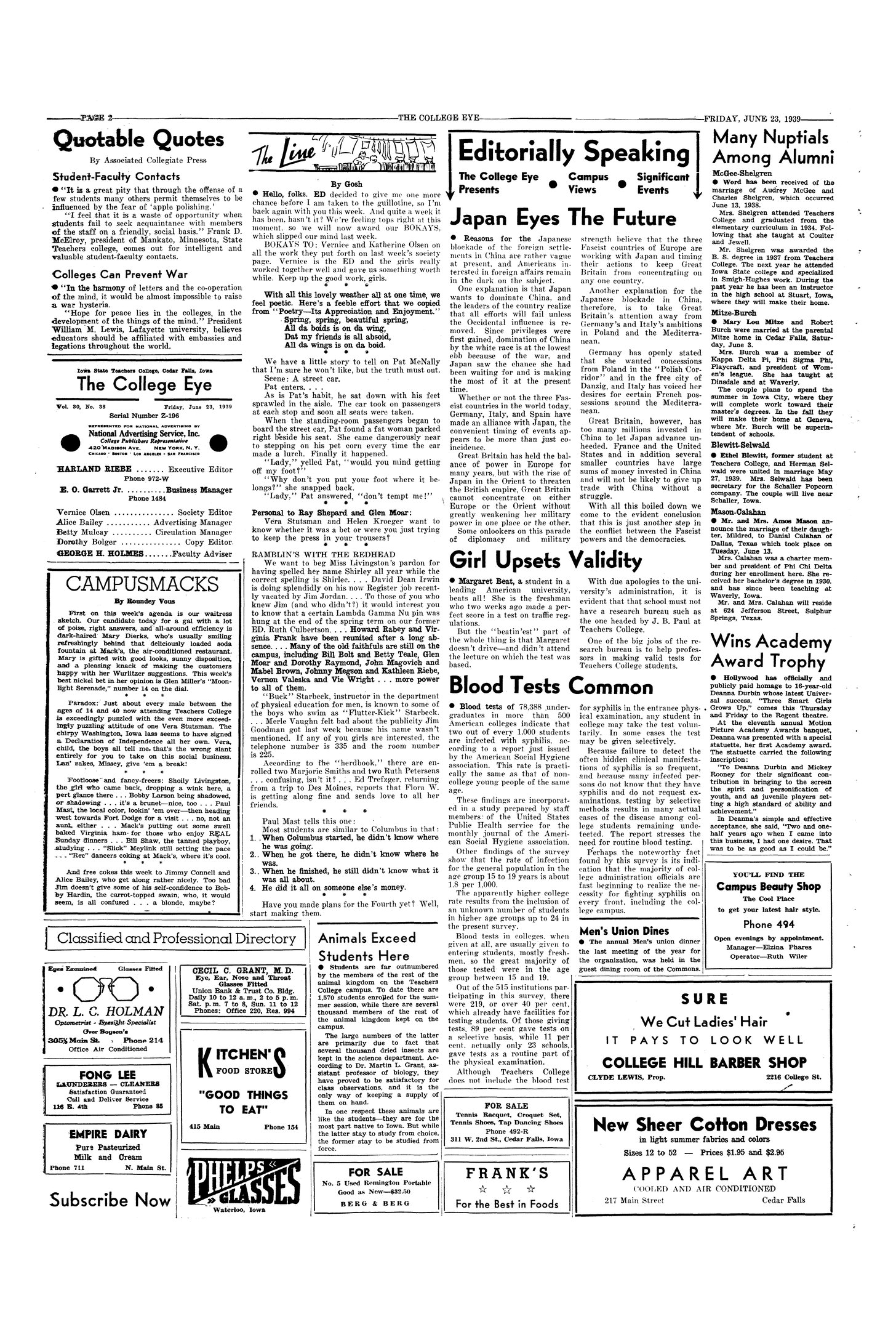 | Editorially speaking; the College Eye; campus views; significant events; Japan eyes the future | There is a conflict between Fascist powers and democracies. |