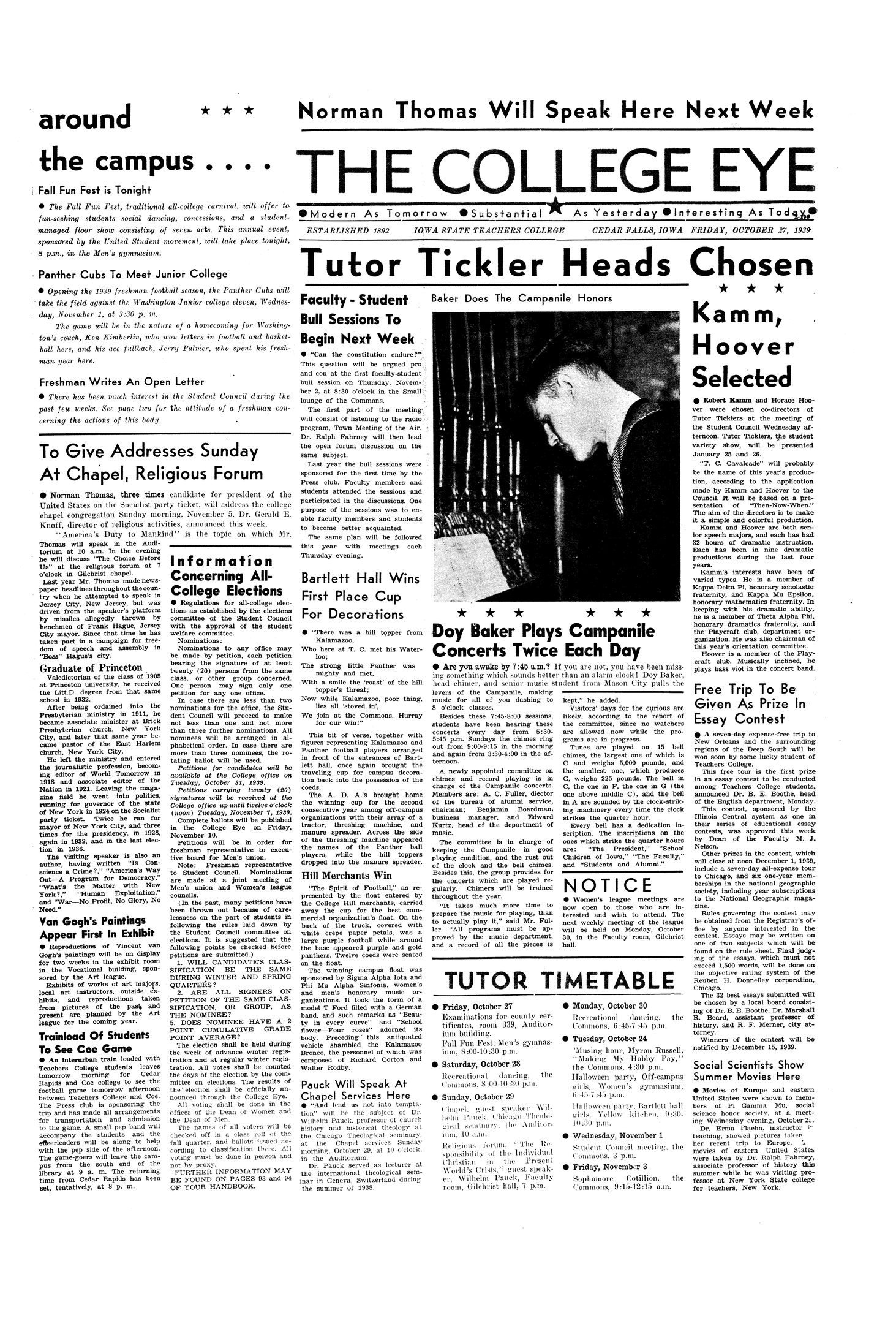 | Doy Baker plays Campanile concerts twice each day | Campanile Committee arranges for upkeep; brief description of the bells; photo. |